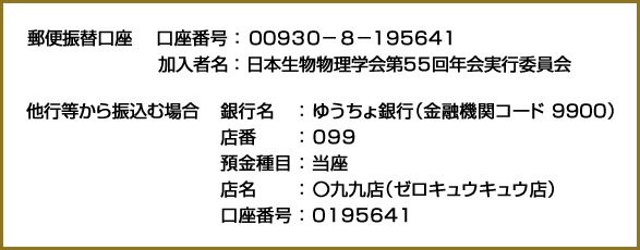 | 注) | 日本生物物理学会会員の「年度会費」と第55回年会諸費用(参加費・懇親会費)の送金先は異なります.お間違いにならないようご注意ください. |